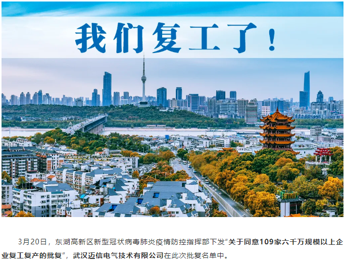 首頁>文章中心>公司新聞>復(fù)工了!邁信電氣于3月25日正式恢復(fù)生產(chǎn)發(fā)貨!