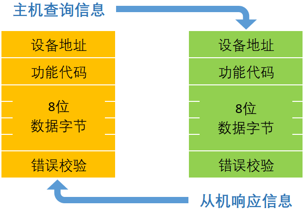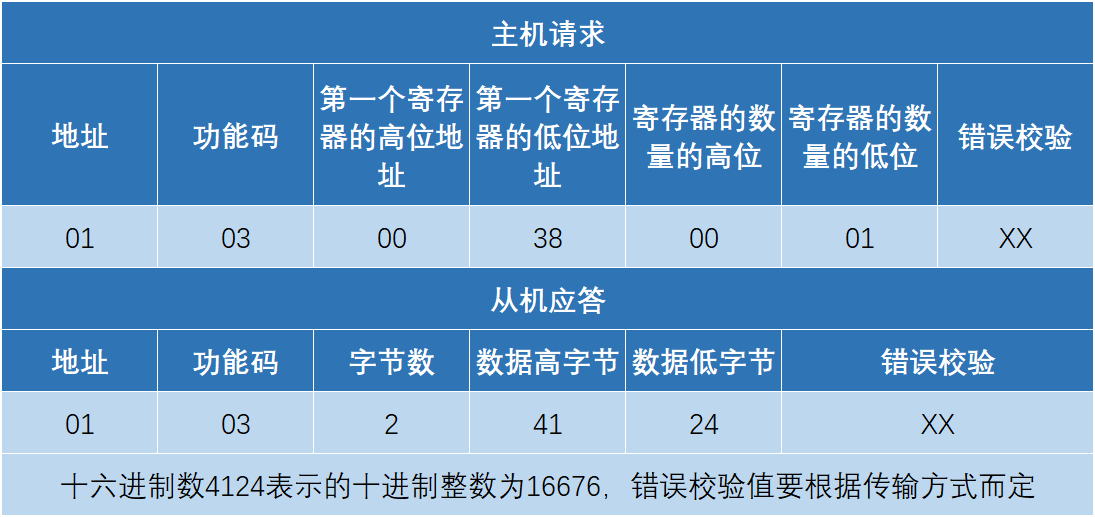 從站應(yīng)答:設(shè)備地址和命令號(hào)和上面的相同。返回的字節(jié)數(shù):表示數(shù)據(jù)的字節(jié)個(gè)數(shù),也就是數(shù)據(jù)1,2...n中的n的值。例子中返回了1個(gè)模擬量的數(shù)據(jù),因?yàn)橐粋€(gè)模擬量需要2個(gè)字節(jié)所以共2個(gè)字節(jié)。數(shù)據(jù)高低字節(jié):41和24代表返回的1個(gè)模擬量的值,即十進(jìn)制的16676。錯(cuò)誤校驗(yàn)為CRC校驗(yàn)。