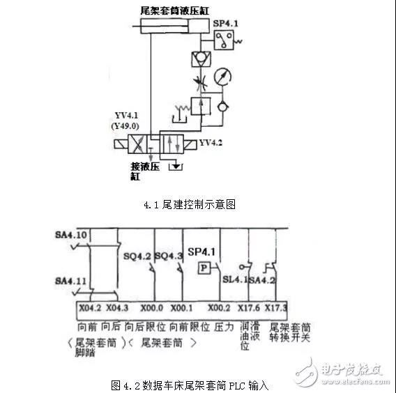 故障診斷:在系統(tǒng)診斷狀態(tài)下,調(diào)出PLC輸入信號,發(fā)現(xiàn)腳踏尾座開關(guān)輸入X04.2為“1”,尾座套筒轉(zhuǎn)換開關(guān)X17.3為“1”,潤滑油液面開關(guān)X17.6為“1”。調(diào)出PLC輸出信號,當腳踏尾座開關(guān)被壓下時,輸出Y49.0為“1”,同時電磁閥也得電。這說明系統(tǒng)PLC輸入/輸出狀態(tài)均正常,分析尾座套筒液壓系統(tǒng)的故障可能性較大。