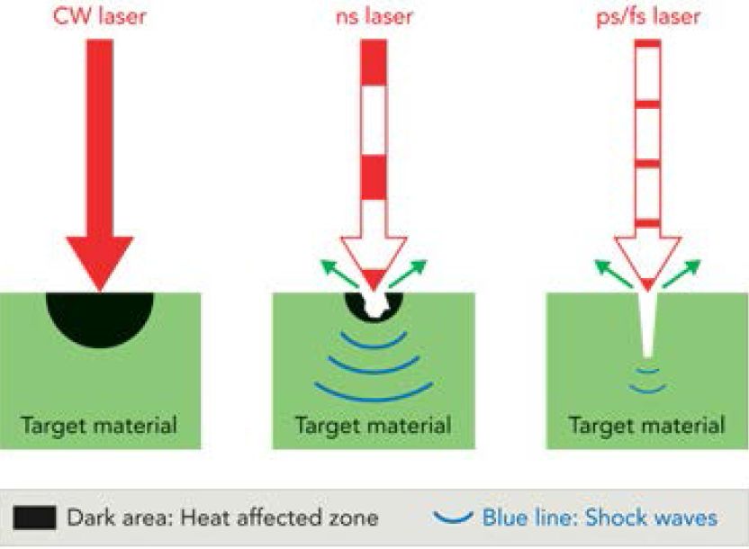 人們很早就嘗試?yán)眉す膺M(jìn)行微加工。但是由于激光的長脈沖寬度和低激光強(qiáng)度造成材料熔化并持續(xù)蒸發(fā),雖然激光束可以被聚焦成很小的光斑,但是對材料的熱沖擊依然很大,限制了加工的精度。唯有減少熱影響才能提高加工質(zhì)量。