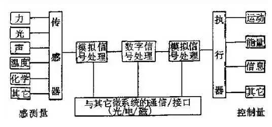 MEMS簡(jiǎn)單來說就是將傳統(tǒng)傳感器的機(jī)械部件微型化后,和其他元件如微執(zhí)行器和微電子器件組成的集成體。雖說如此,MEMS并不像編碼器一樣必須要有電路板、碼盤等固定元件,其高集成度特點(diǎn)可以根據(jù)不同的工控場(chǎng)合進(jìn)行任意元件的組合,而典型的MEMS系統(tǒng)如下圖所示: