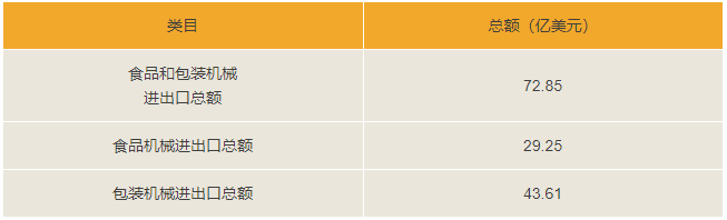 海關(guān)統(tǒng)計數(shù)據(jù)顯示,2015年中國食品和包裝機械進出口總額72.85億美元,其中,食品機械進出口總額29.25億美元,包裝機械進出口總額43.61億美元。