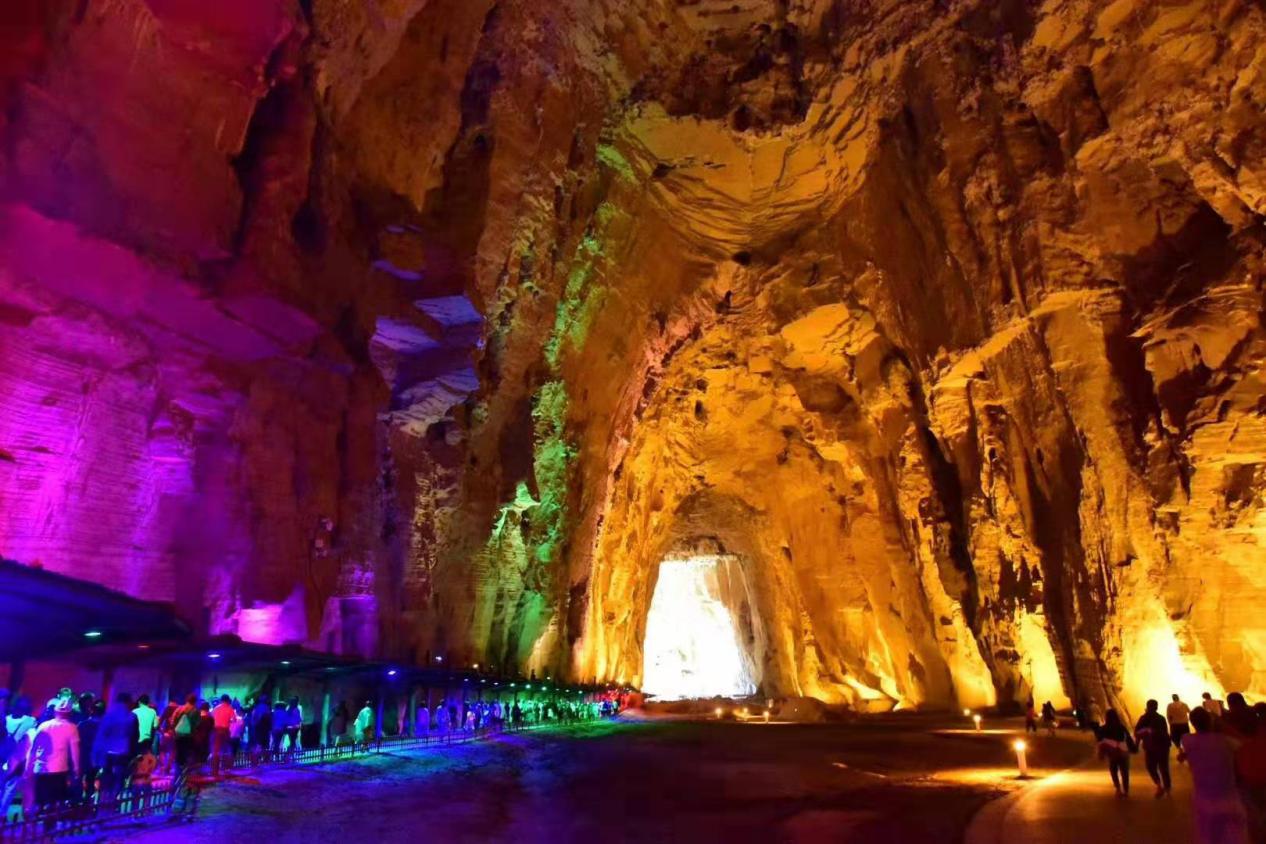 騰龍洞,2005年被評為中國“最具旅游價值溶洞”,由水洞、旱洞等景區(qū)組成。恩施人的母親河——清江由此進入地下,形成“臥龍吞江”的壯麗景觀,其旱洞洞中有山,山中有洞,等著我們去探尋他的神秘莫測。當坐大巴車到達騰龍洞景區(qū)的時候,走過一段迂回曲折的 山間石板路,映入眼簾的就是清江水隨著奇特的山形地貌展現出來的“臥龍吞江”的壯觀畫面。每個看到這里的游客無不發(fā)出驚嘆之聲,并用手機記錄這一令人稱奇的景色。接著到達一壁之隔的旱洞,洞口的高度和寬度足以讓一架直升機輕松飛行,洞口的熱氣球也可以讓你領略到在洞口最高處盡收眼底的風景。隨著洞內的指示牌往里走,洞內氣溫會讓你感覺到絲絲涼意,但洞里的五彩斑斕的燈光映著蜿蜒曲折、奇形怪狀的巖石則別有一番景象。由于旱洞全長59.8公里,觀賞洞內的原生態(tài)土家歌舞劇——《夷水麗川》和國內獨一無二的光感藝術“激光秀”時,我們都是乘坐電瓶車到達觀賞地點,沿途的各種景象讓我們感到了人類無窮的創(chuàng)造力和創(chuàng)新力。激光秀的表演真正將光的技術發(fā)揮到極致,將人、光、水、舞臺藝術融合的天衣無縫,展現出無與倫比的藝術表演,令人震撼。原生態(tài)土家歌舞劇——《夷水麗川》則將土家族的民族文化以歌舞劇的形式表現出來,印象深刻的《六口茶》和《龍船調》讓人感覺親切又溫暖,同時又感受到了土家民族文化的博大精深。