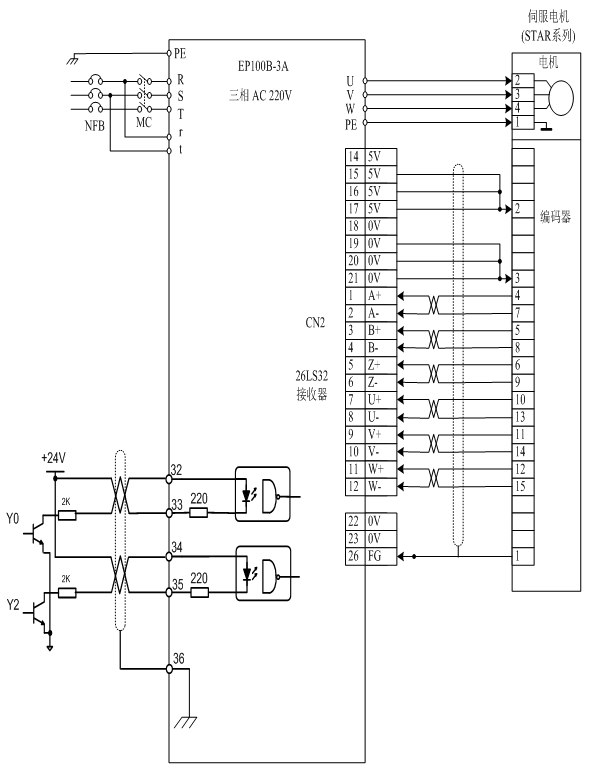 A、正確接好電源線r、t、R、S、T,電機動力線U、V、W、PE,編碼器線(CN2)。